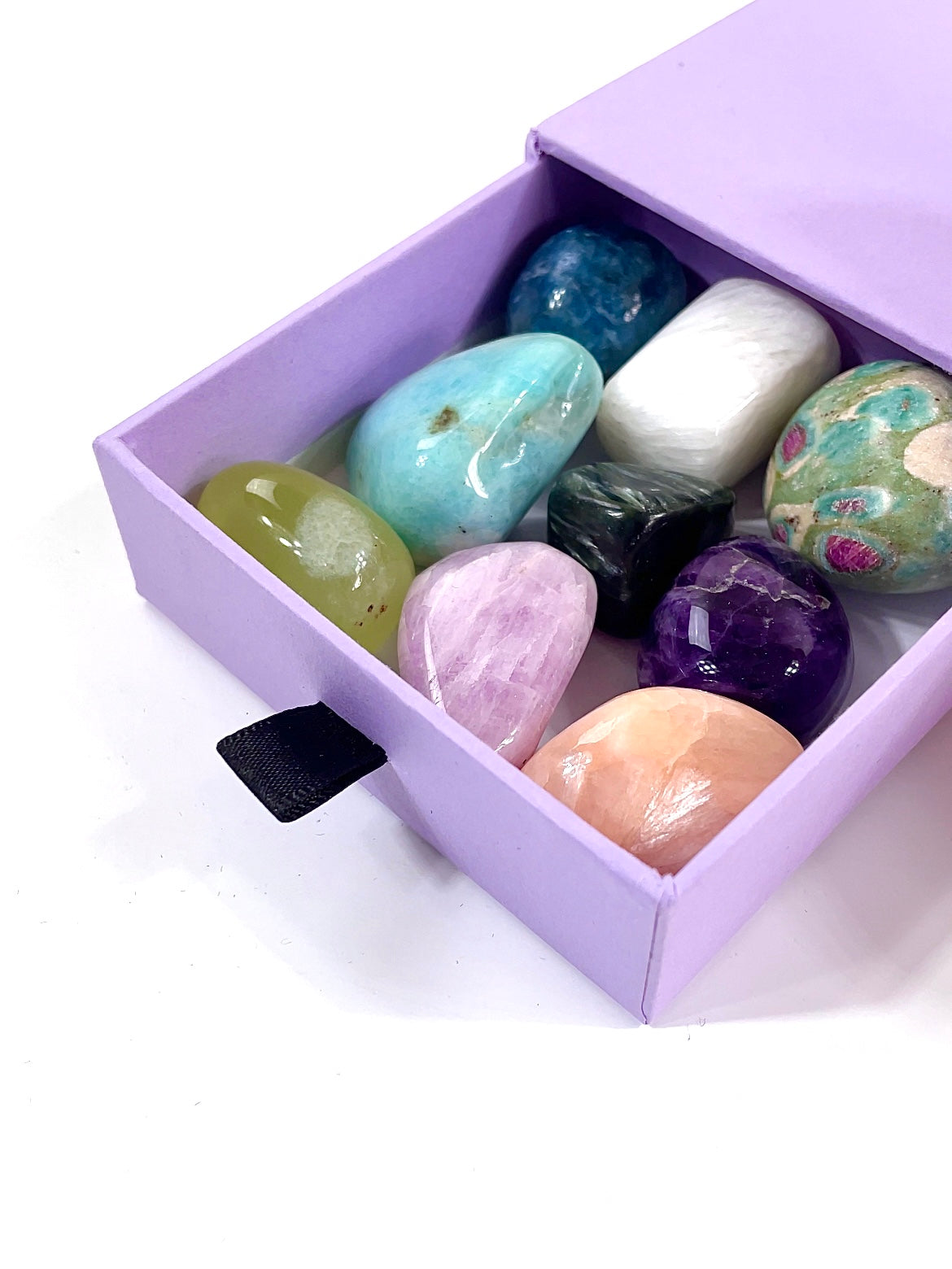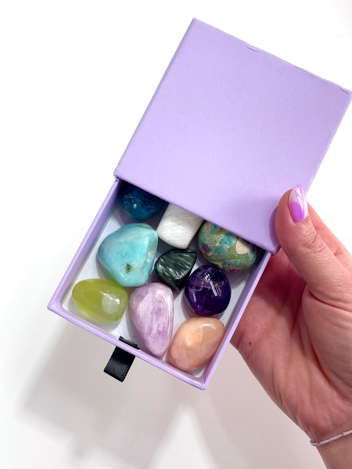 Tu es fan de pierres roulées mais que tu n'arrives pas à choisir parmi notre sélection ? Je te présente la BOX DÉCOUVERTE ! Composée de 9 pierres roulées parmi les 20 proposées sur notre boutique, elle ravira tes yeux et fera à coup sûr... chavirer ton cœur !