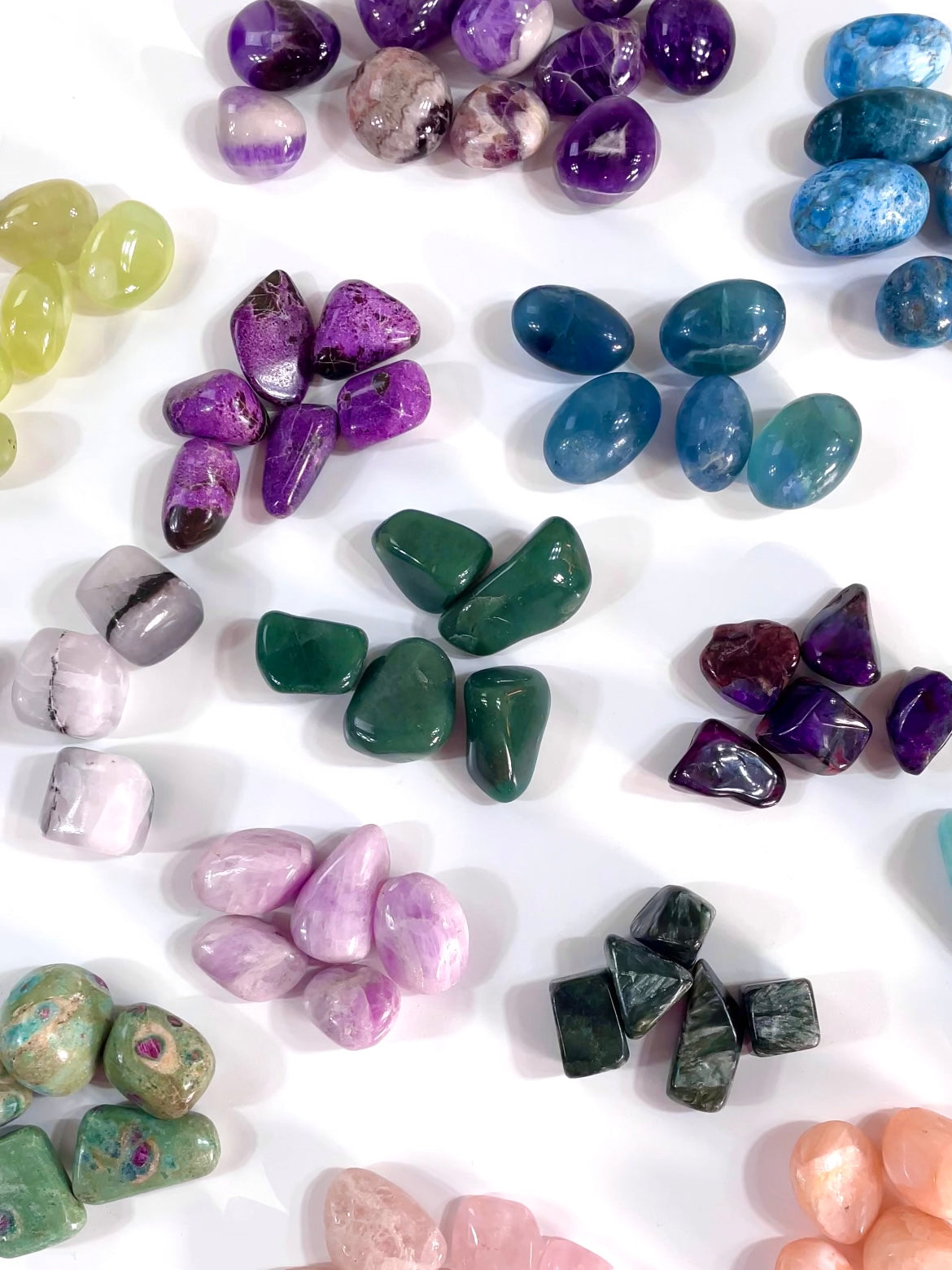 Lot de 9 pierres roulées parmi la liste suivante : Améthyste, Apatite bleue, Aventurine, Préhnite, Stichtite, Manganocalcite, Fluorite, Stilbite, Dumortiérite, Obsidienne neige, Séraphinite, Hypersthène, Nundérite, Grenat, Opale Calcédoine, Scolecite, Kunzite, Rubis Fuchsite, Amazonite, Morganite.